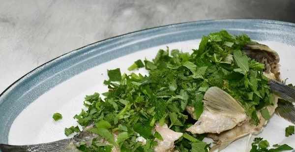 1.將鯽魚治凈,在肉厚處剞斜一字花刀後備用。鍋入煮魚水燒沸,下入鯽魚小火煮熟,撈出瀝水後擺盤,在魚身上撒一半藿香碎(見圖1~3)。