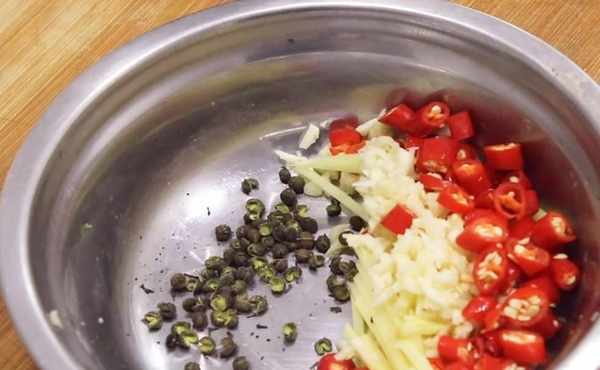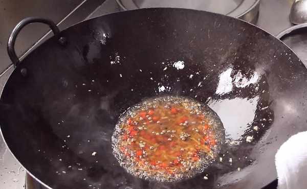 鍋內燒油,油燒熱以後,放入青花椒爆香,再倒入生薑、大蒜、小米椒,翻炒出香辣味,從鍋邊淋入適量的清水。
