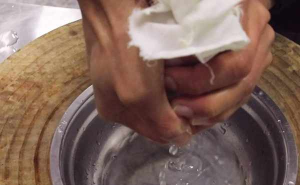 然後把黃瓜放在紗佈中,用力擠壓出水分。這一步的目的是擠凈黃瓜中的水分,讓黃瓜更容易吸收料汁入味,口感更脆。