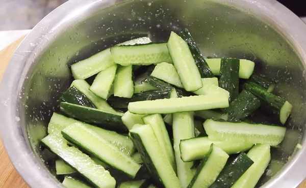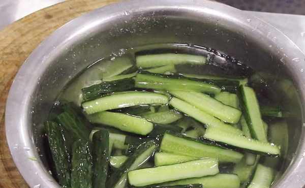 把黃瓜醃出的水分倒掉,放入清水中,洗凈黃瓜表面的鹽分以後撈出。