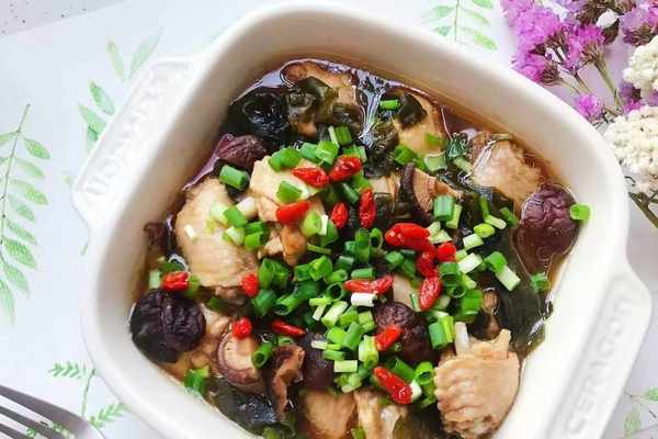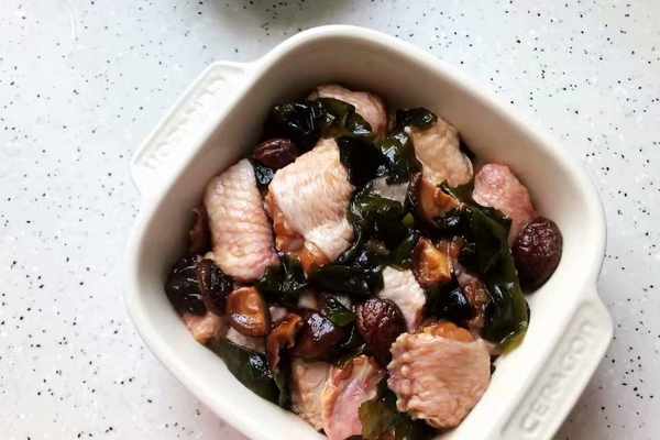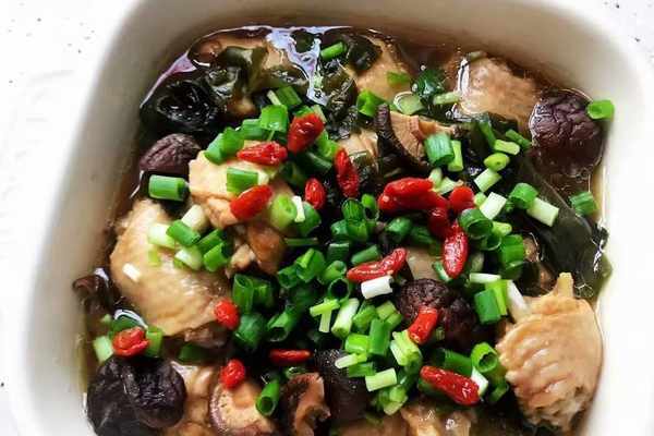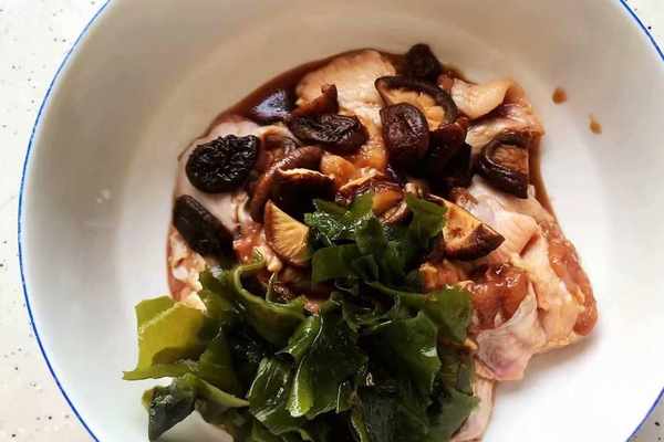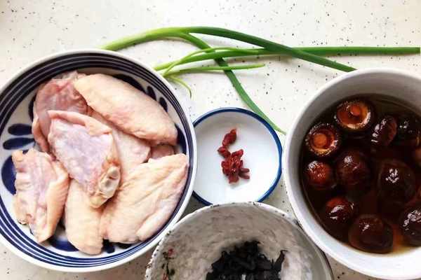 【烹飪食材】:雞翅(翅中)6個、裙帶菜適量、幹香菇適量、枸杞少許、小蔥適量、鹽適量、生抽一勺、料酒一勺、白砂糖適量