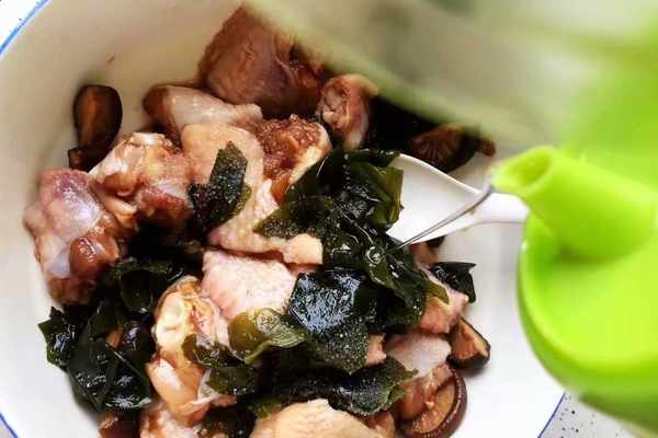 6、浸泡好的香菇稍微切一下,然後浸泡好的裙帶菜簡單手撕一下,不然太大,將處理好的香菇還有裙帶菜放入醃制好的雞翅上面。