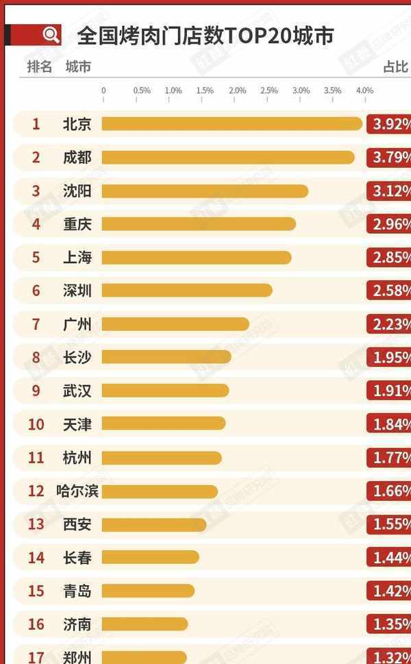 紅餐品牌研究院調研瞭整體的烤肉數據後發現,西南是更愛吃烤肉的地區,在全國烤肉門店數top20的烤肉城市中,成都和重慶均在前五席之列。烤肉是一種休閑形式的餐飲消費,相比北上廣的快節奏,西南顯然更愛社交,值得一提的是,廣州居然排在第七位,可見烤肉在粵菜強勢的廣州並不受寵。