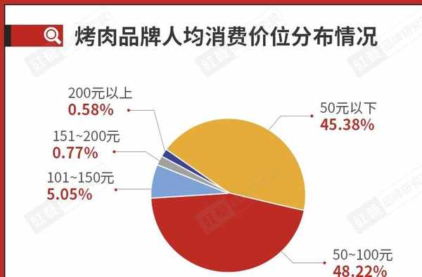 紅餐品牌研究院調研得知,50元以下人均的烤肉占比達到瞭45.38%,這些門店一般是自助式消費,如39.9元/位的自助烤肉等,大多門店的限制時間是90分鐘。