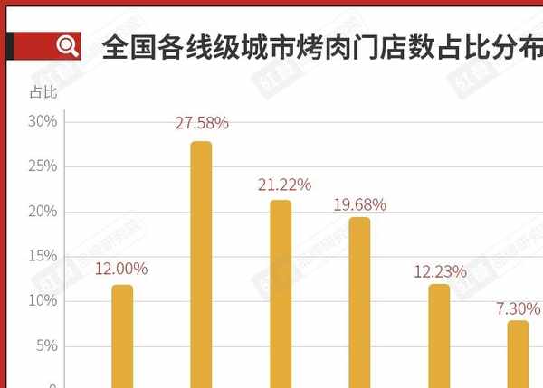 而從各線級城市烤肉門店數占比分佈來看,烤肉在新一線和二線發展得最為火熱,門店數占比總和達到瞭48.8%,而一線城市的烤肉門店數占比為12%,當然這也跟城市體量有關,一線城市不到5座,占比12%已經算很高瞭,可見烤肉品類有下沉的潛力,新一線和二線生活節奏微緩,確實比較適合烤肉品類的生存。三線城市的占比為19.68%,而四線占比才僅12.23%,由此看,烤肉的下沉市場最好別越過三線。