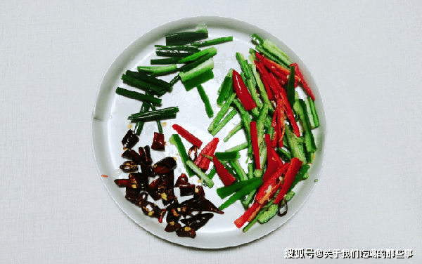 蒜瓣去皮後切片,香蔥洗幹凈後切段,幹辣椒切段。青辣椒、紅辣椒洗幹凈,去掉辣椒蒂,切成細絲備用。