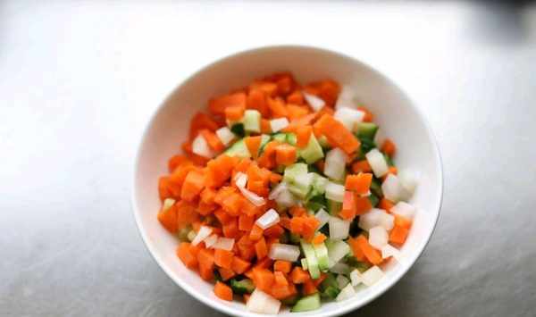 5、胡蘿卜丁,黃瓜丁,還有洋蔥丁,最好都是一樣的大小,然後放在一起,混合均勻備用。