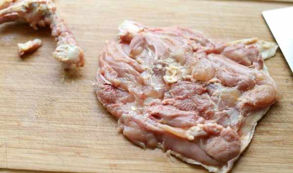2、雞腿肉也是一樣,清洗幹凈,然後去除中間的骨頭,留下一整塊雞腿肉,這塊雞腿肉最好要保持完整,後面還需要用這樣裹住食材。