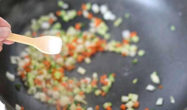 6、鍋中加入少量的油燒熱,把準備好的蔬菜丁下鍋翻炒一下,炒出香味,接著加入適量的鹽,翻炒均勻,炒制入味。