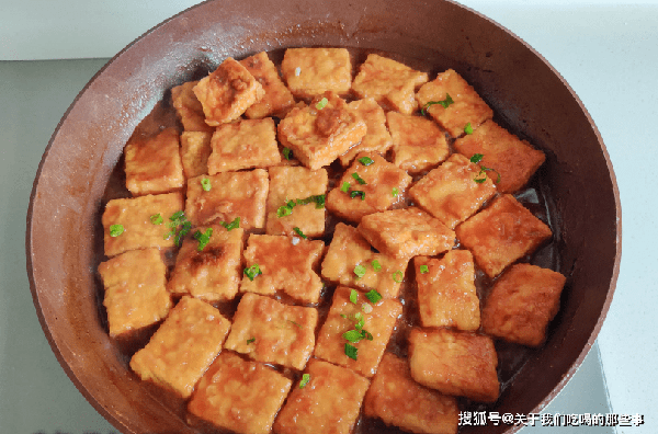 3、鍋裡留底油,翻入蔥花爆香,倒入煎好的豆腐翻炒均勻,加入適量生抽、食鹽炒勻,淋入適量清水燉2分鐘,大火收汁後即可出鍋。