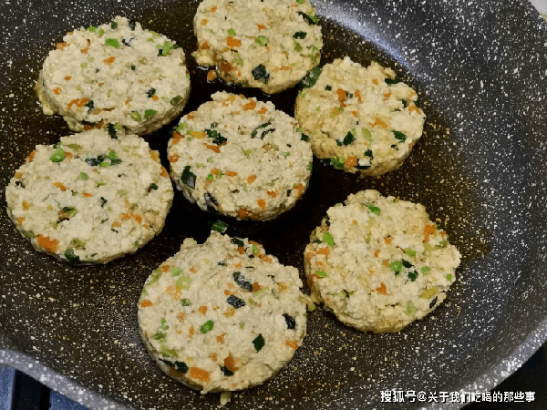 3、放入適量鹽、雞精、生抽、香油攪拌均勻,再加一把蔥花拌勻即可。平底鍋倒入適量油燒熱,放入一個模具,把豆腐泥放進去,抹平後煎一會兒。豆腐餅定型後翻個面,等到兩面焦黃後即可出鍋。