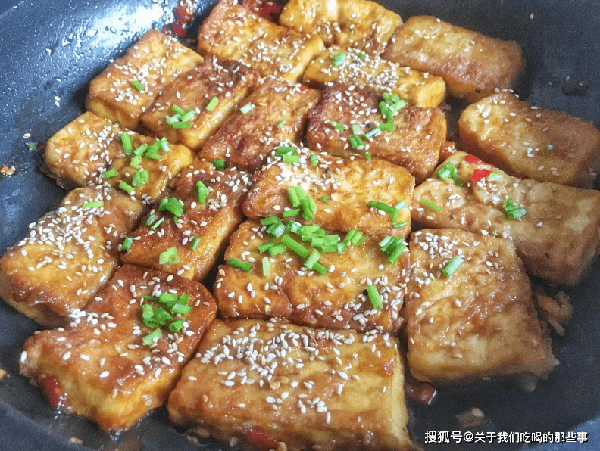 3、碗裡加入適量食鹽、生抽、白糖、剁辣椒,清水 ,用筷子攪拌均勻,香蔥剝洗幹凈後切碎。豆腐煎至焦黃後倒入料汁,快速翻炒均勻,大火收汁,湯汁快收幹時撒入熟白芝麻、蔥花,即可關火出鍋。