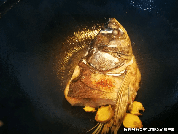 2、鍋裡倒入適量油燒熱,放入薑片爆香,下入魚頭小火煎一會兒,底部定型後翻個面,煎至兩面金黃,沿鍋邊淋入一勺料酒去腥,倒入適量開水煮開。
