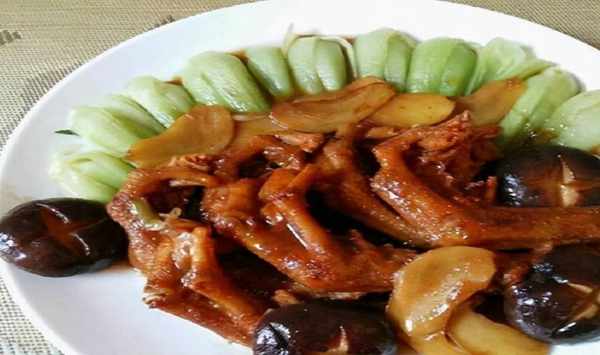 3、用花生油起鍋,下鴨掌,濺入紹酒,加淡上湯,調入味精、精鹽、白糖、蠔油、胡椒粉等味料,下香菇,加濕淀粉15克打芡,再加麻油、包尾油、老抽拌勻,即可食用。