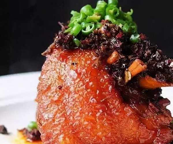2、撈出趁熱在其表皮上抹勻糖色,投入高油溫鍋裡炸上色後,撈入鹵水鍋裡,待小火鹵至豬肘軟熟時,撈出裝盤。