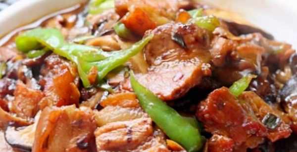 材料:香菇、五花肉、薑片、蔥花、蒜片、青椒、料酒、鹽、蠔油、糖、老抽