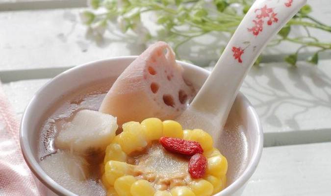 6.到時間後,下入玉米,山藥,蓮藕,大火燒開,轉小火,繼續煮30分鐘,到時間後,加入鹽調味,關火,盛出即可,一鍋美味又養生的湯就做好瞭。