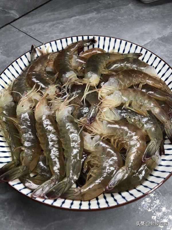將蝦剝殼去頭,保留蝦尾,可以選擇用小刀沿著蝦背剖開,去掉蝦腸。這裡我們購買的是新鮮活蝦,可不用去蝦線,隻去一下蝦頭就好,將處理好的蝦放入盤中。