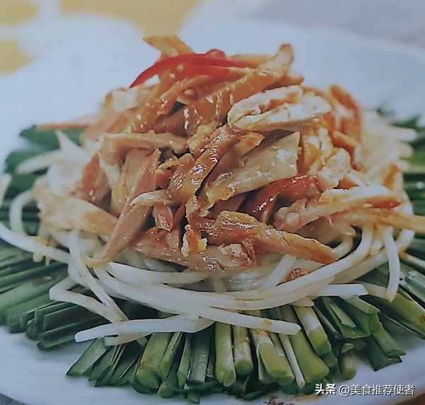 4鹽、醬油、白糖、味精、香油放入碗中調勻,制成味汁。將韭菜段放在盤底,綠豆芽放在韭菜上,鴨肉絲堆放在豆芽上,澆上味汁拌勻即成。