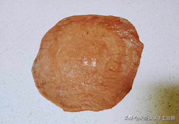 12.取一份小面團,搟圓搟薄,隻在中間抹上少許黃油。四周邊緣不要抹到瞭四周邊緣不要抹到瞭,四周邊緣不要抹到瞭,新的事情說三遍。
