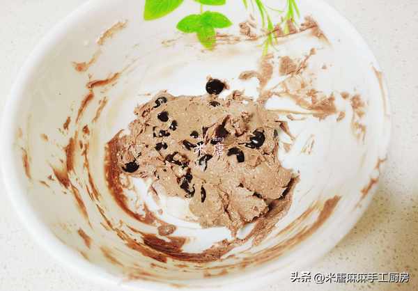7.松弛時間制作乳酪餡。奶油奶酪軟化,加入糖粉混勻。加入可可粉混勻,加入黑巧克力混勻即可。