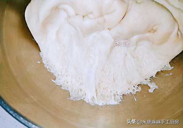 5.加入軟化黃油,揉至完全階段。出現均勻韌性的薄膜,裂口邊緣光滑,拉扯面團不易斷。