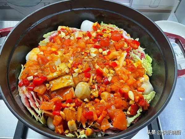 7.鍋中刷油,鋪上洋蔥片。將肥牛白菜段豎擺放在上面,加入香菇,魚丸等食材。淋上熬好的番茄汁和調好的料汁,加水沒過食材