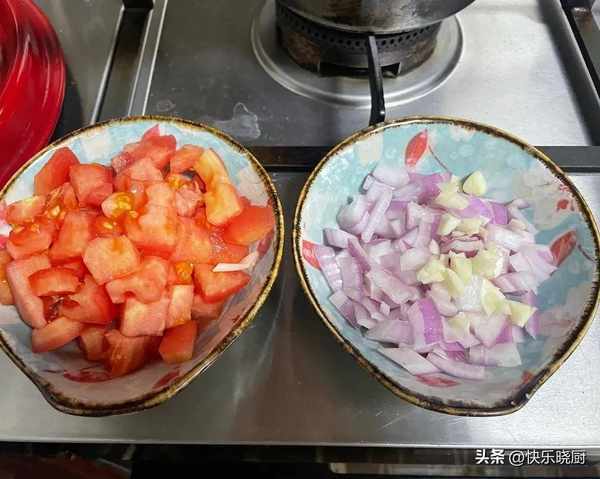 2.將西紅柿去皮切成小丁,洋蔥切小丁,蒜,薑切碎備用