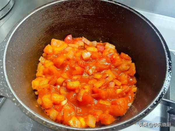 3.鍋中燒油,油熱轉小火下入洋蔥,蒜,薑炒香。放入番茄丁,加入食鹽,番茄醬,將番茄翻炒出沙加入開水燜煮2分鐘左右備用