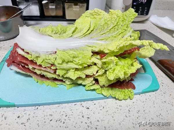 6.按照圖上的方式將肥牛片和白菜整齊的擺放好然後切段備用
