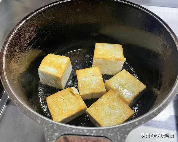 4.豆腐切小塊放入鍋中煎至兩面金黃備用