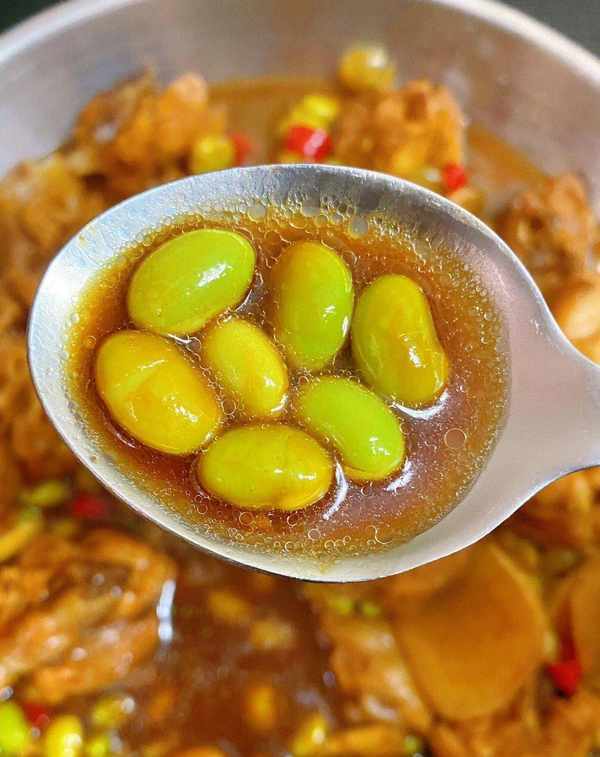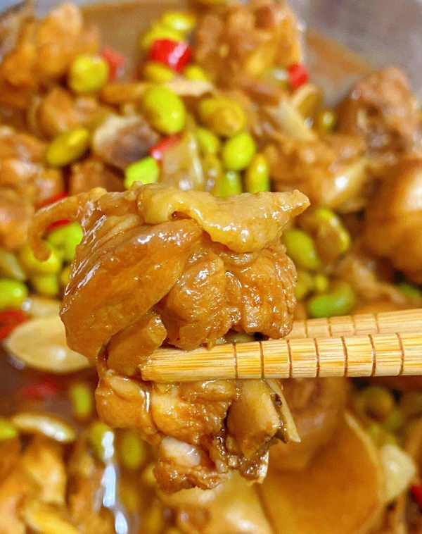 倒入醬汁和毛豆,翻炒均勻後加入足夠的水,使雞肉完全浸沒。