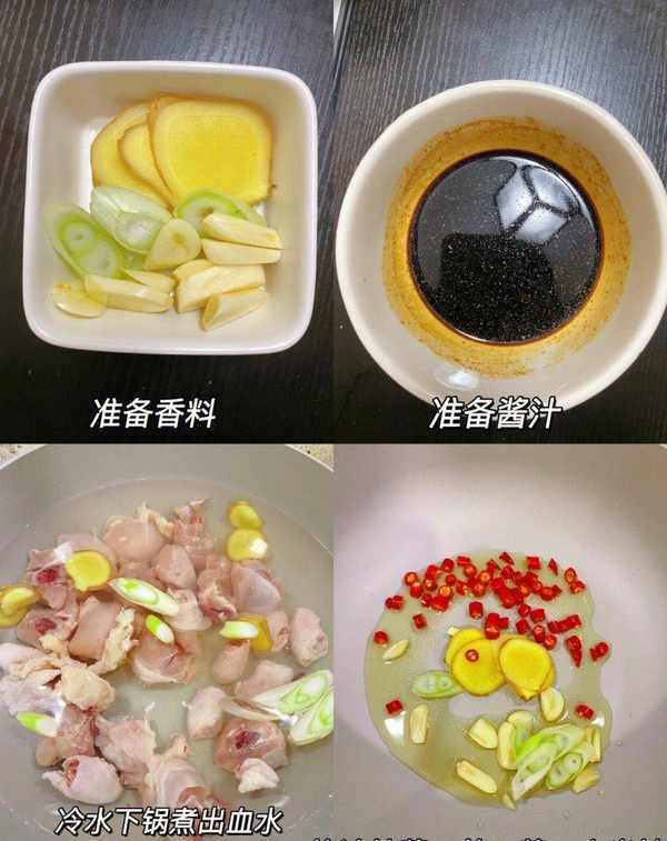 準備食材:蔥薑蒜、小米辣和毛豆備好;將雞腿冷水下鍋,加入蔥薑、料酒,煮危險水後洗幹凈擦幹水分。