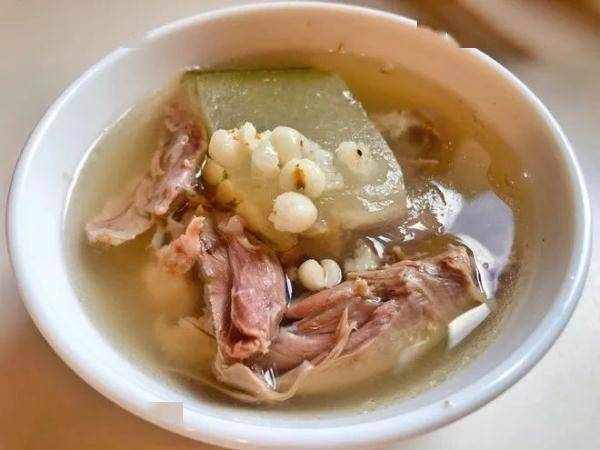 做法:將薏米、芡實、陳皮加適量清水浸半小時備用。將鴨肉去皮去脂肪洗凈,入沸水中焯去血水,切成塊狀,與生薑一起放入燒熱的油鍋中略炒,然後加入薏米、芡實、陳皮、精鹽、胡椒粉,加適量水煮湯,煮約45分鐘後加入連皮冬瓜再煮15分鐘即可。