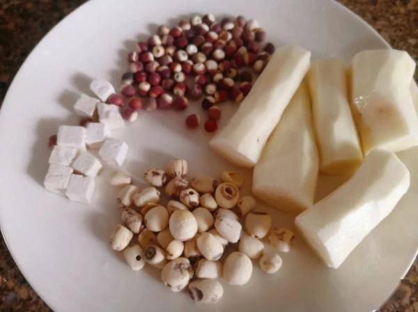 材料:鮮土茯苓400克,扁豆60克,生薑3片,豬脊骨500克。