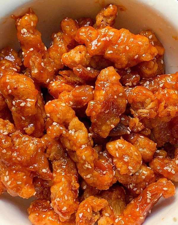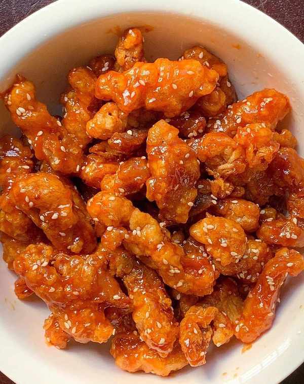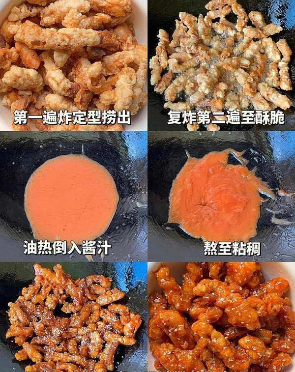 將醬汁倒入鍋中熬制至粘稠,放入炸好的裡脊肉條中,均勻地裹上醬汁。