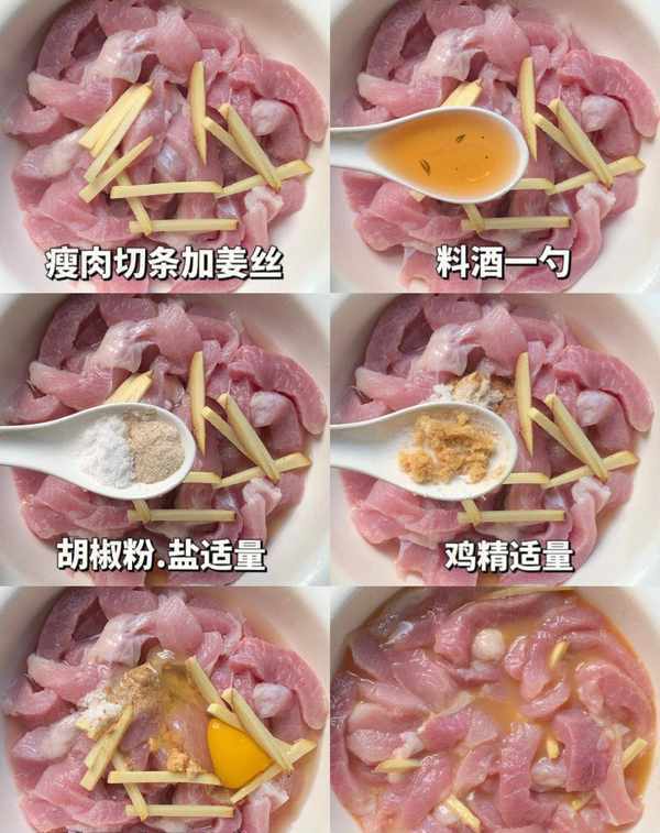 把裡脊肉切成條狀,加入薑絲、料酒、胡椒粉、雞精、鹽和雞蛋攪拌均勻,醃制20分鐘。