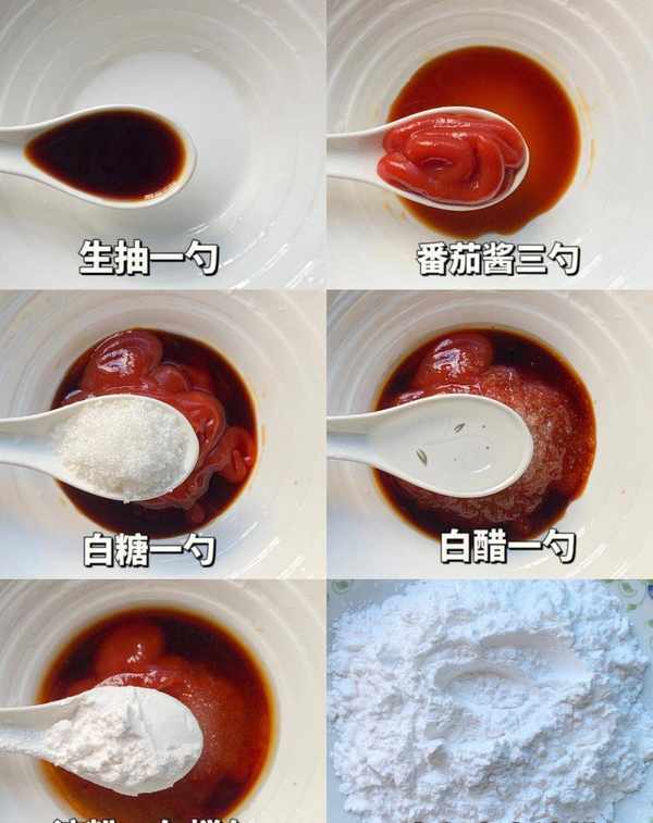 準備糖醋醬料,將生抽、番茄醬、白糖、白醋和淀粉攪拌均勻備用。