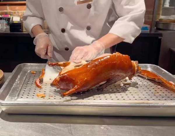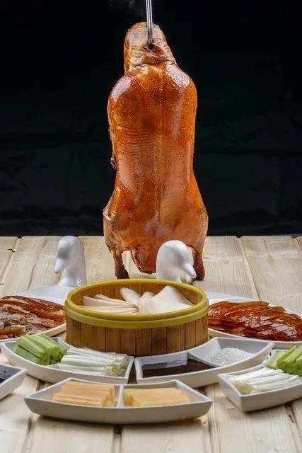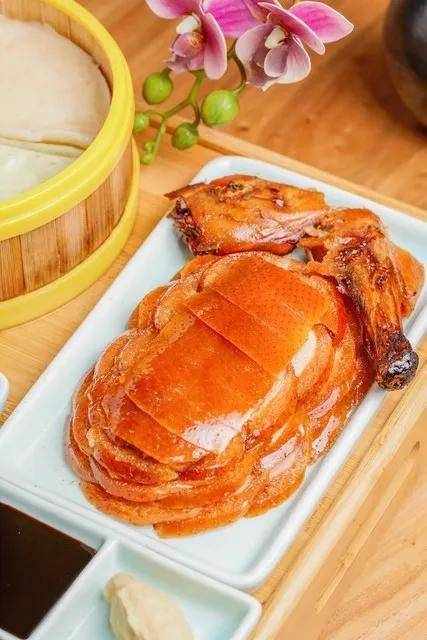 然後將醃好的鴨子拿出來,特定的方式進行懸掛,然後烤制,烤制時間一般為45分鐘至一小時左右,在烤的過程中,需要不斷翻面,並使用各種手法,如用香油,蒜薑等塗抹,以增加鴨子的口感和香氣,最後箱子出爐後,將烤好的鴨子切成薄片,可帶皮或不帶皮都可,然後配合蔥絲,醬油等調料食用。