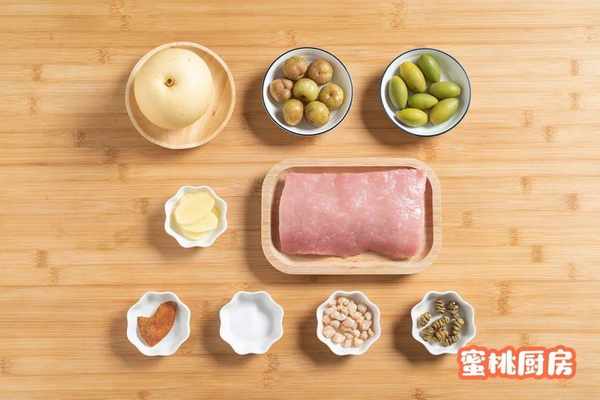 豬裡脊肉300g 石斛8g 鮮橄欖7個 鮮油柑7個 雪梨1個 瑤柱20g 薑片6片 陳皮1小塊 鹽適量