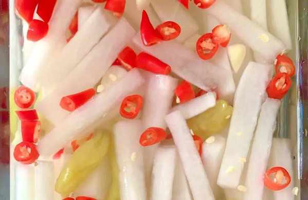 蘿卜含有豐富的維生素C,能夠增強免疫力。泡椒是一種辣椒制品,能夠幫助消化和促進新陳代謝。將蘿卜切成小塊,加入適量的泡椒,醃制15分鐘即可。