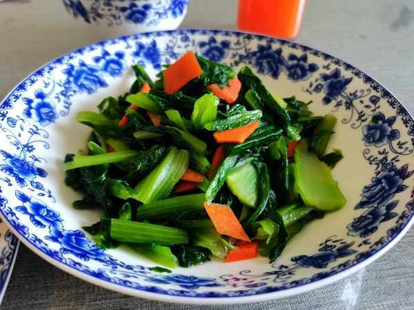 7、油麥菜焯水,放幾片紅蘿卜,撒一丁點鹽,幾滴味極鮮,一勺香醋,幾滴香油,攪拌均勻,吃著脆嫩爽口。