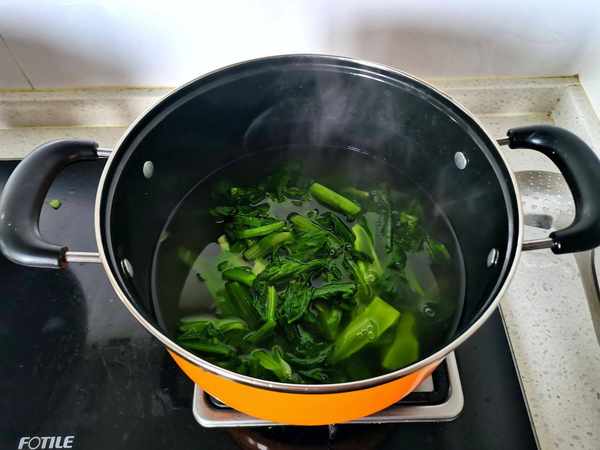 6、再來準備涼拌菜,油麥菜焯水,焯水的時候,撒一點鹽,幾滴油,焯水後的綠葉菜更加嫩綠。