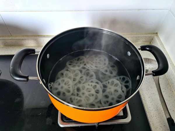 8、藕片焯水,蓮藕片用擦片刀擦出來,又薄又均勻,焯水一分鐘左右,焯水的時候,給水裡滴幾滴白醋,會使藕片吃著又脆又嫩。