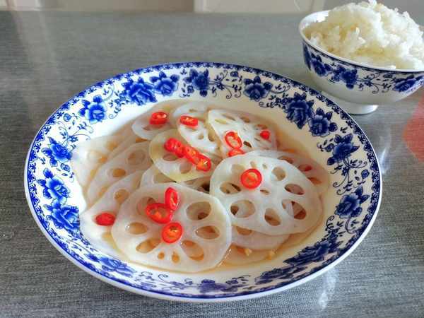 9、藕片裝盤,撒上紅辣椒圈,鍋裡熱花椒油,澆到紅辣椒圈上,小碗裡撒半勺鹽、幾滴味極鮮,兩勺白醋,再倒入一點涼開水,攪拌均勻,澆到藕片上,脆嫩爽口的蓮藕片做好瞭。