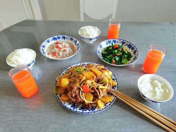 1、今日午餐:大盤雞,香油油麥菜,酸辣藕片,紅蘿卜汁,米飯。