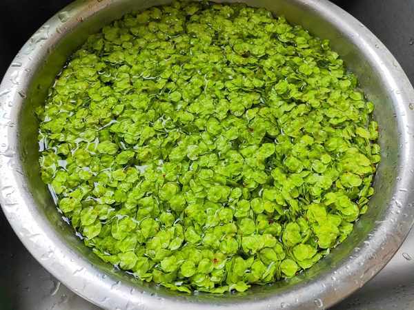 2.摘好的榆錢沖洗兩三遍,將表面的灰塵雜質清水幹凈後,再放到淡鹽水中浸泡15分鐘左右,目的是殺菌和去蟲卵。