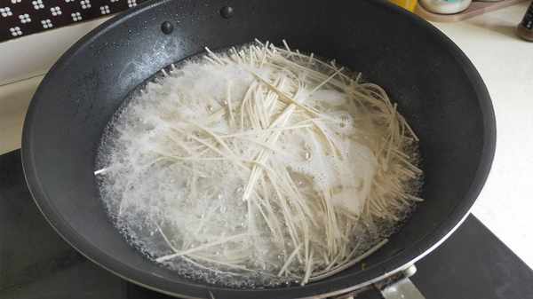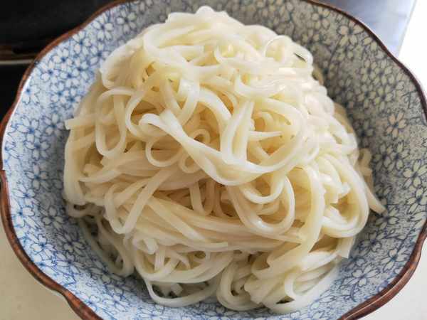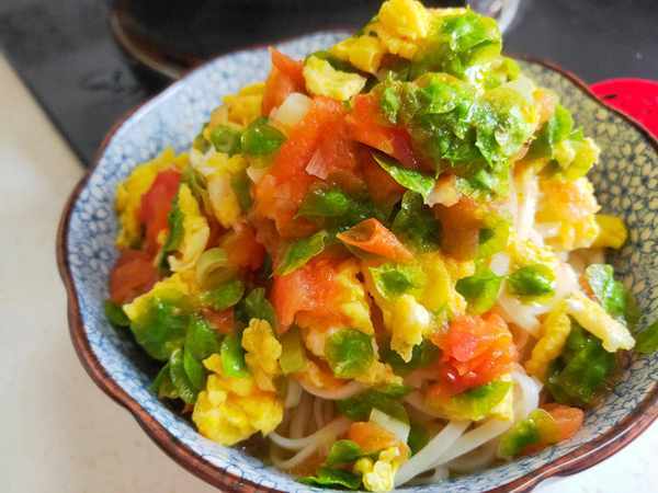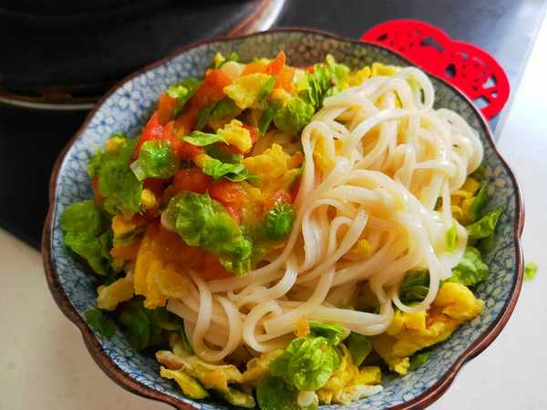 5.提前燒一鍋開水,水開後放入一把掛面,中間水開時點入2~3次涼水,使面條受熱均勻,全程大約煮4~5分鐘,面條就煮熟瞭,撈出面條放到涼開水中過一下涼,然後撈入碗中,再澆上剛剛做好的榆錢雞蛋面鹵,就可以開吃瞭,真香啊!吃上一口定會讓你回味無窮……