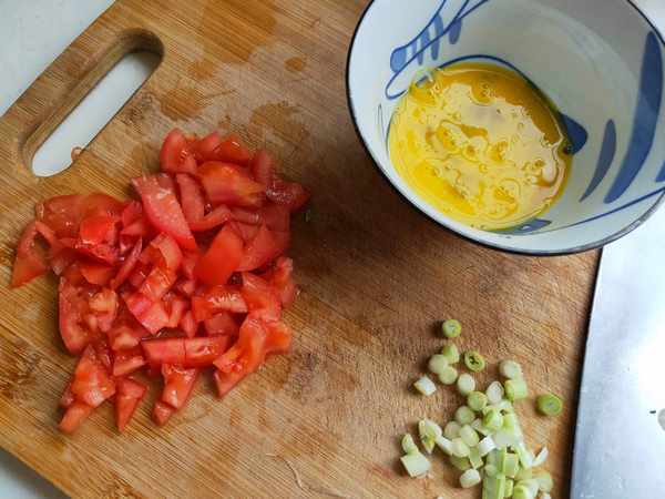 3.然後取一個西紅柿洗凈後切成小丁備用;一棵小蔥切蔥花備用;1~2個雞蛋打入碗中打散備用。
