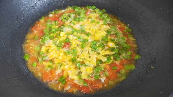 另起鍋加油,油溫5成熱時倒入西紅柿丁翻炒,炒出西紅柿的汁水後再加入蔥花,繼續炒香後倒入適量的清水,然後大火燒開。
